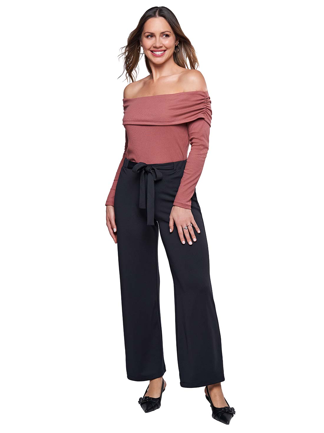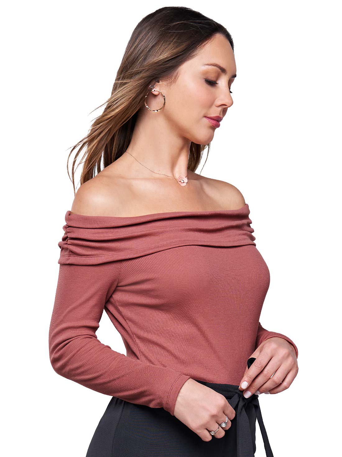 Luce moderna y cómoda con esta blusa strapless de manga larga. Su diseño con pliegues en hombros y tejido tipo rib te brinda estilo y libertad.
