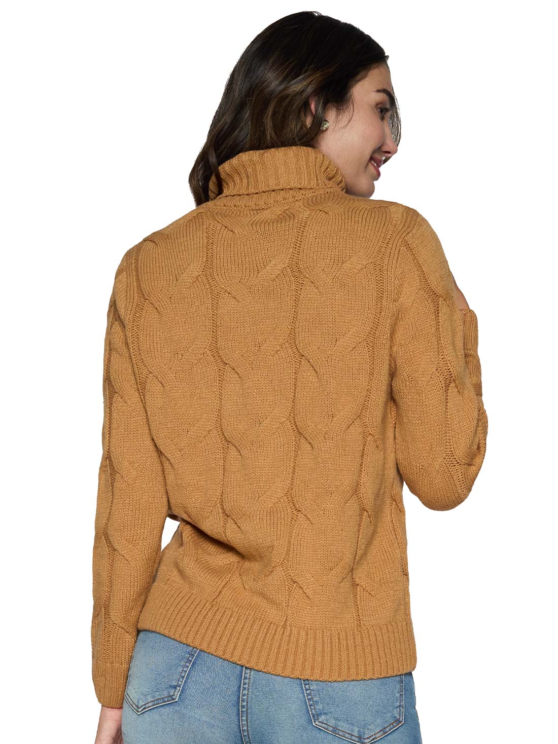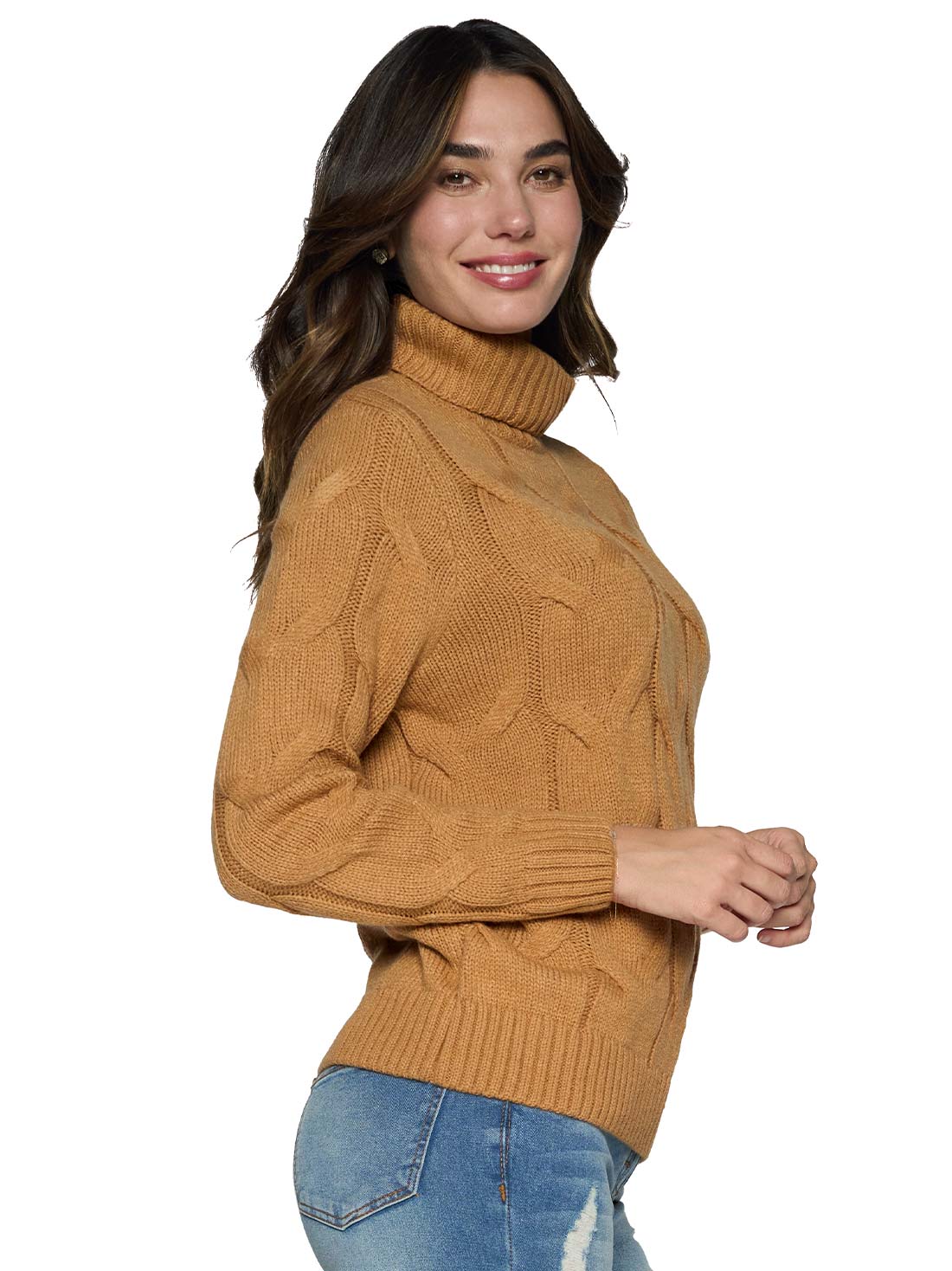 Abraza el confort con este sueter tejido para mujer. Su cuello alto y tejido trenzado te mantienen abrigada, mientras su silueta recta y largo a la cadera lo hacen ideal para combinar con jeans.