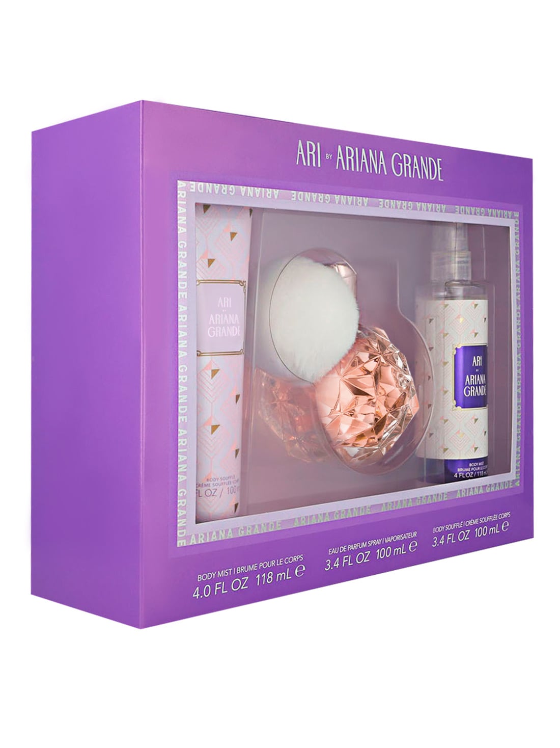 Ari by Ariana Grande es un set lleno de magia y encanto. Su aroma floral frutal envuelve la piel en una dulzura delicada y luminosa. El set incluye fragancia y body cream de 100 ml, y body mist de 118 ml,