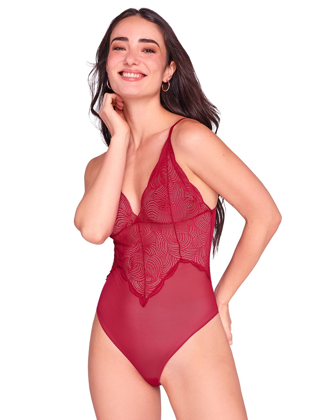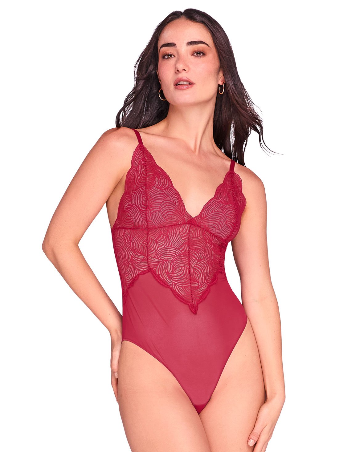 Body de encaje con aplicaciones en copas y abdomen para un look sofisticado. Tejido súper ligero transparente y tirantes ajustables , con broche inferior y puente de algodón para frescura.