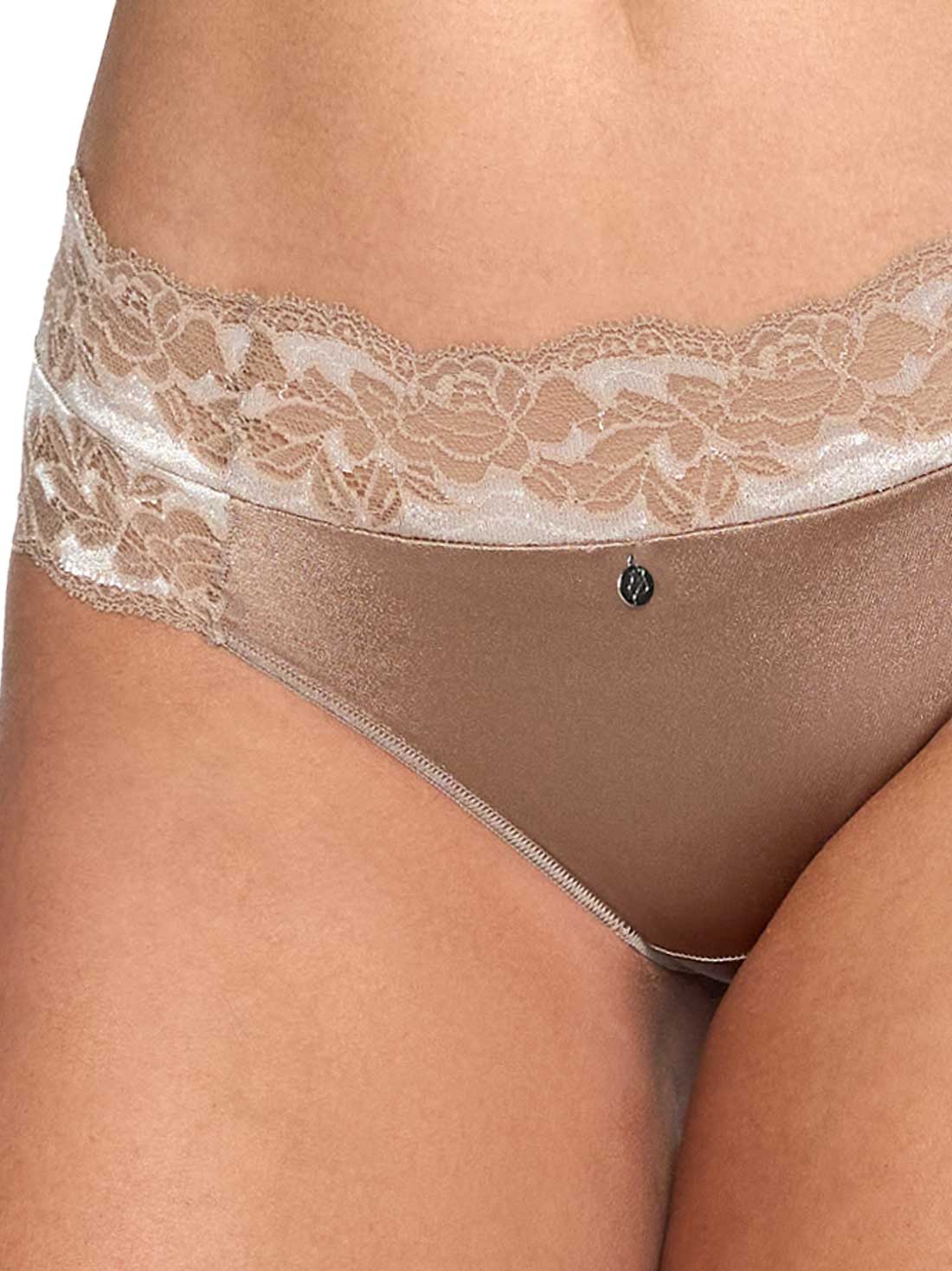 Transforma tu día a día con nuestra panti de encaje bicolor en la parte trasera y cintura, una parte frontal en textura satinada, esta prenda combina elegancia y confort a la perfección.