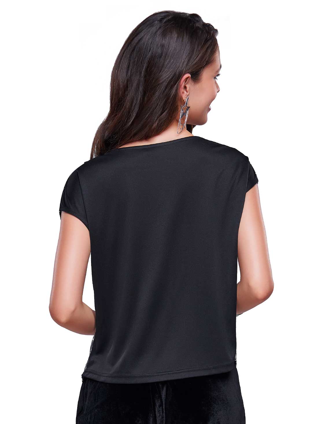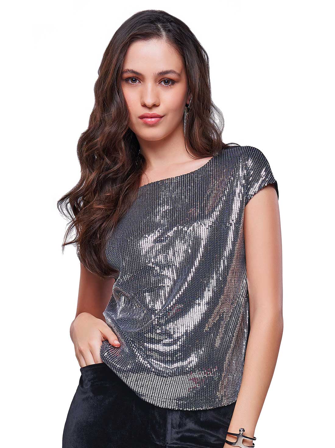 Blusa de lentejuelas con silueta amplia y cuello redondo. Su diseño moderno y espalda lisa la hacen ideal para destacar en eventos o salidas nocturnas. Combínala con jeans o faldas para un look lleno de brillo.