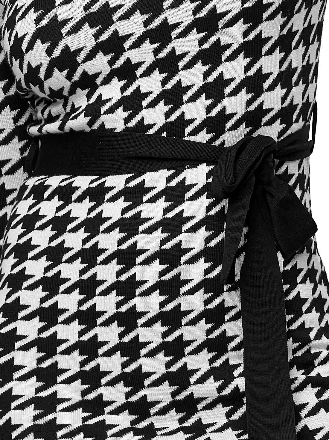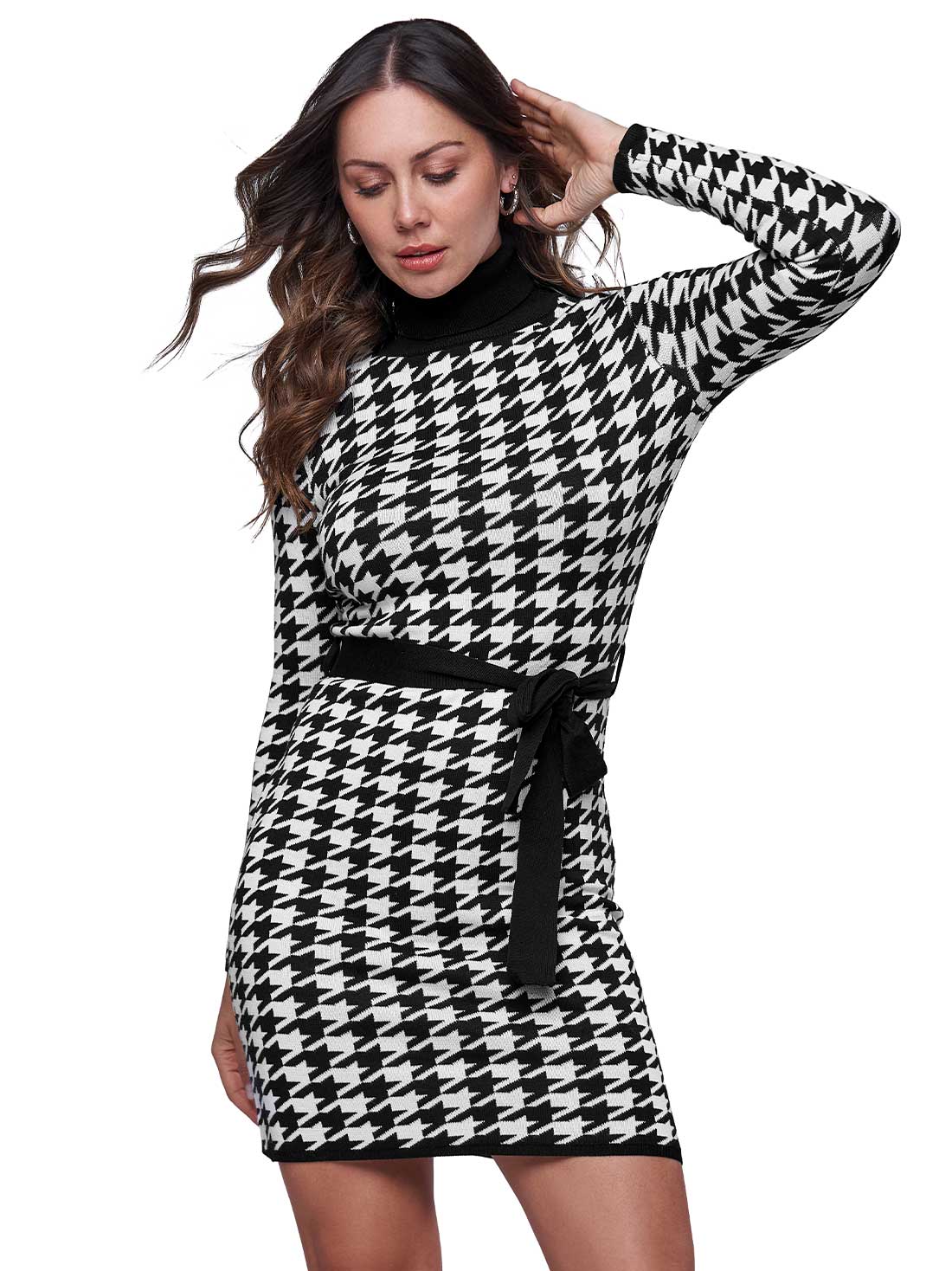 Con un tejido de punto suave y un cinturón removible que define tu figura, este vestido tipo suéter es perfecto para días frescos. Su cuello alto aporta elegancia y el largo a la rodilla lo hace ideal para cualquier ocasión.