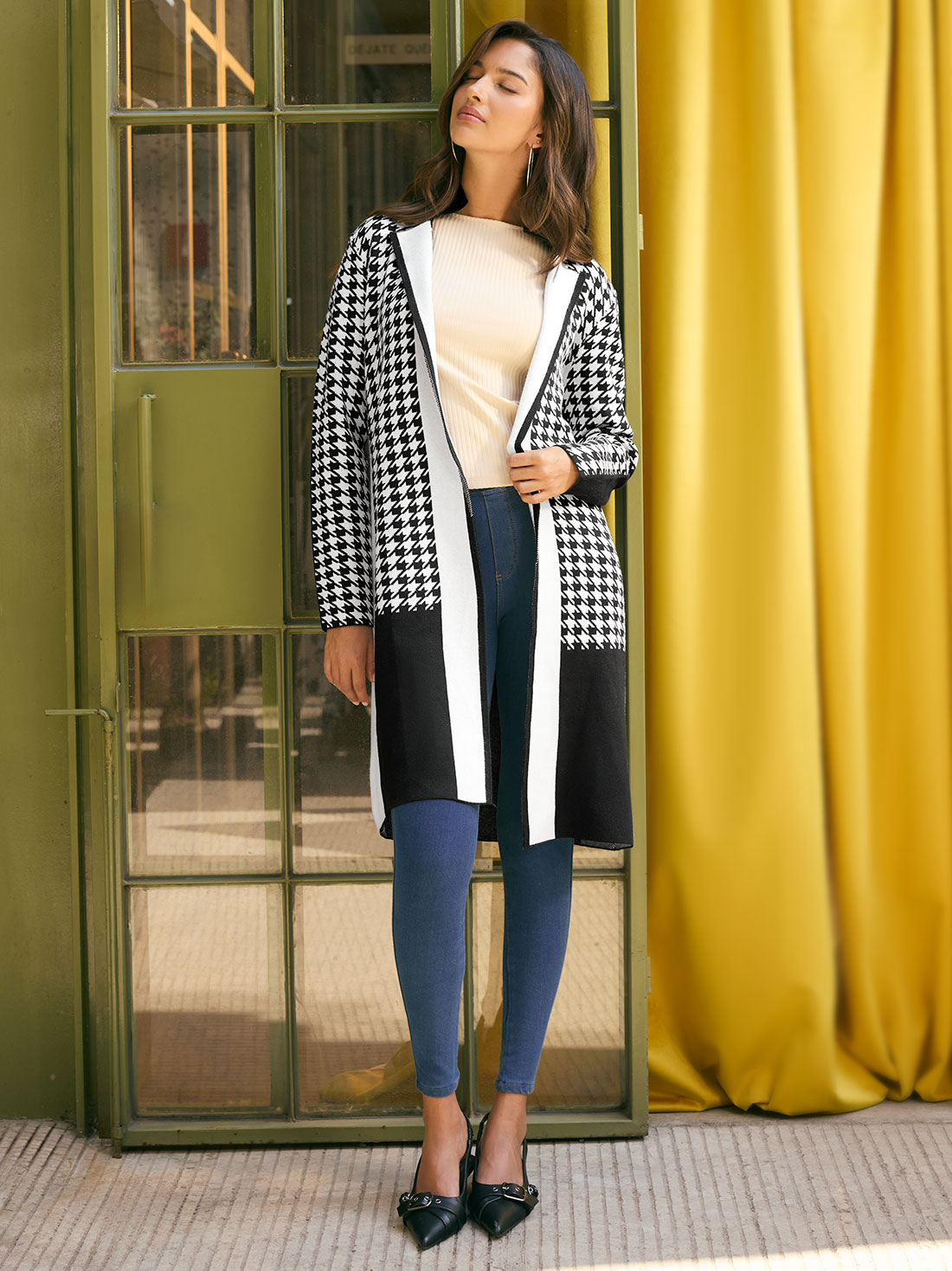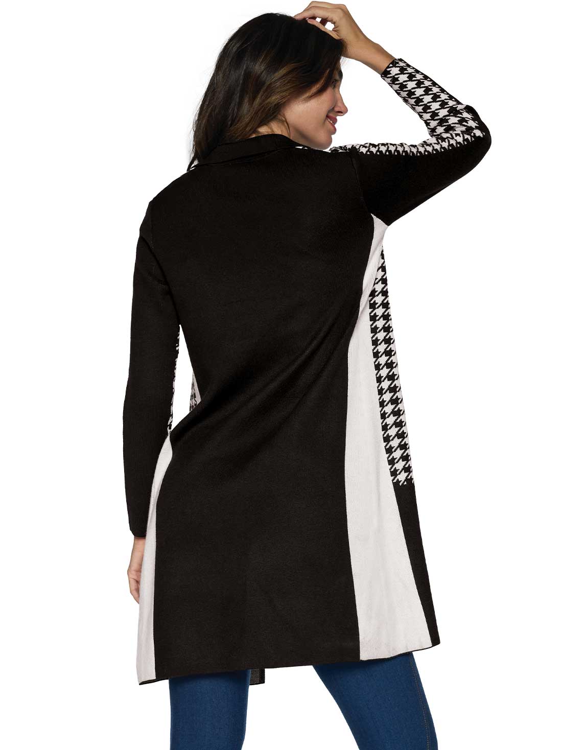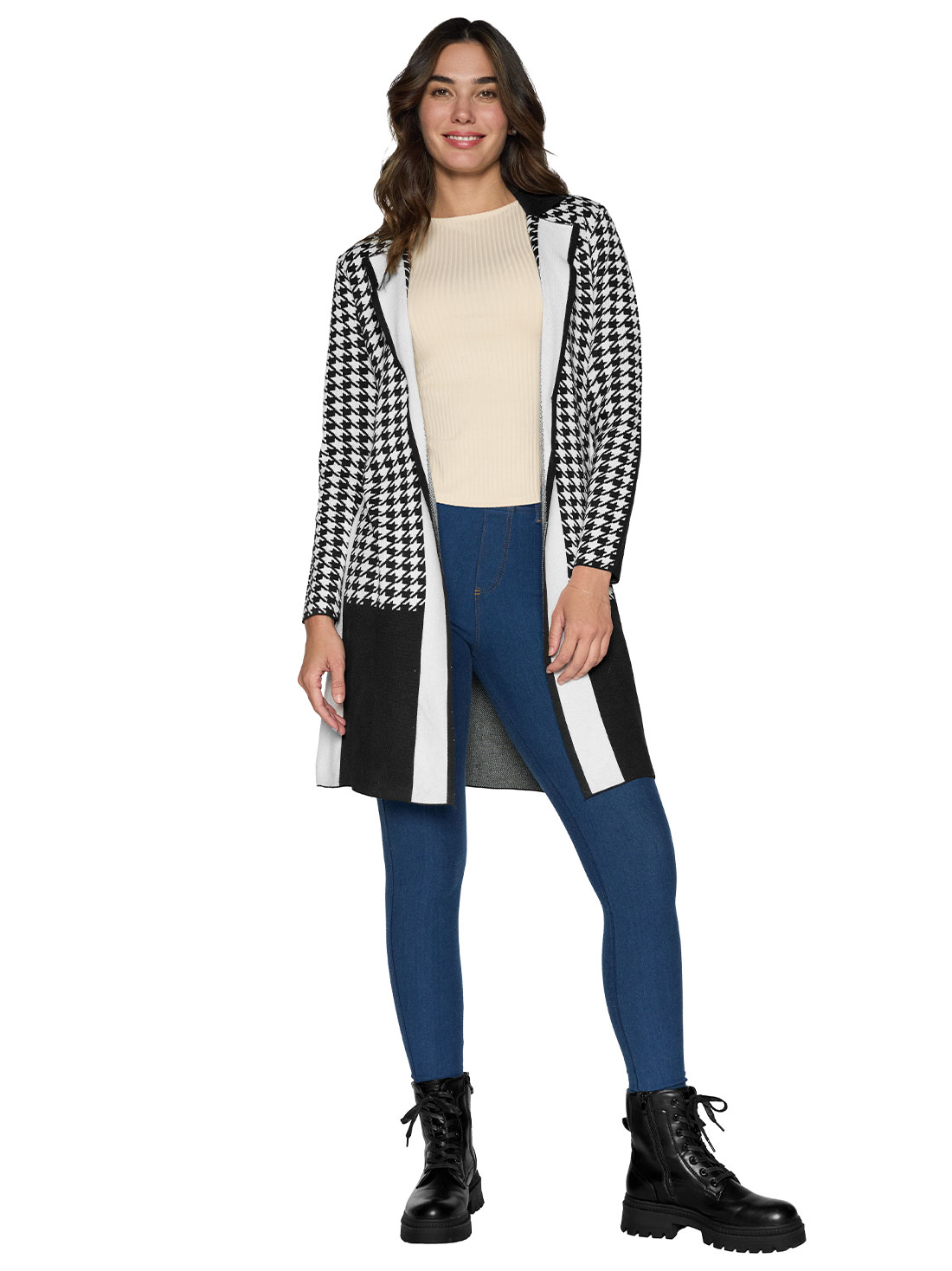 Ideal para complementar tus looks, este sueter largo con cuello solapa y diseño abierto te brinda calidez sin perder estilo. Su silueta amplia y largo a la rodilla lo hacen perfecto para usar sobre vestidos o jeans.