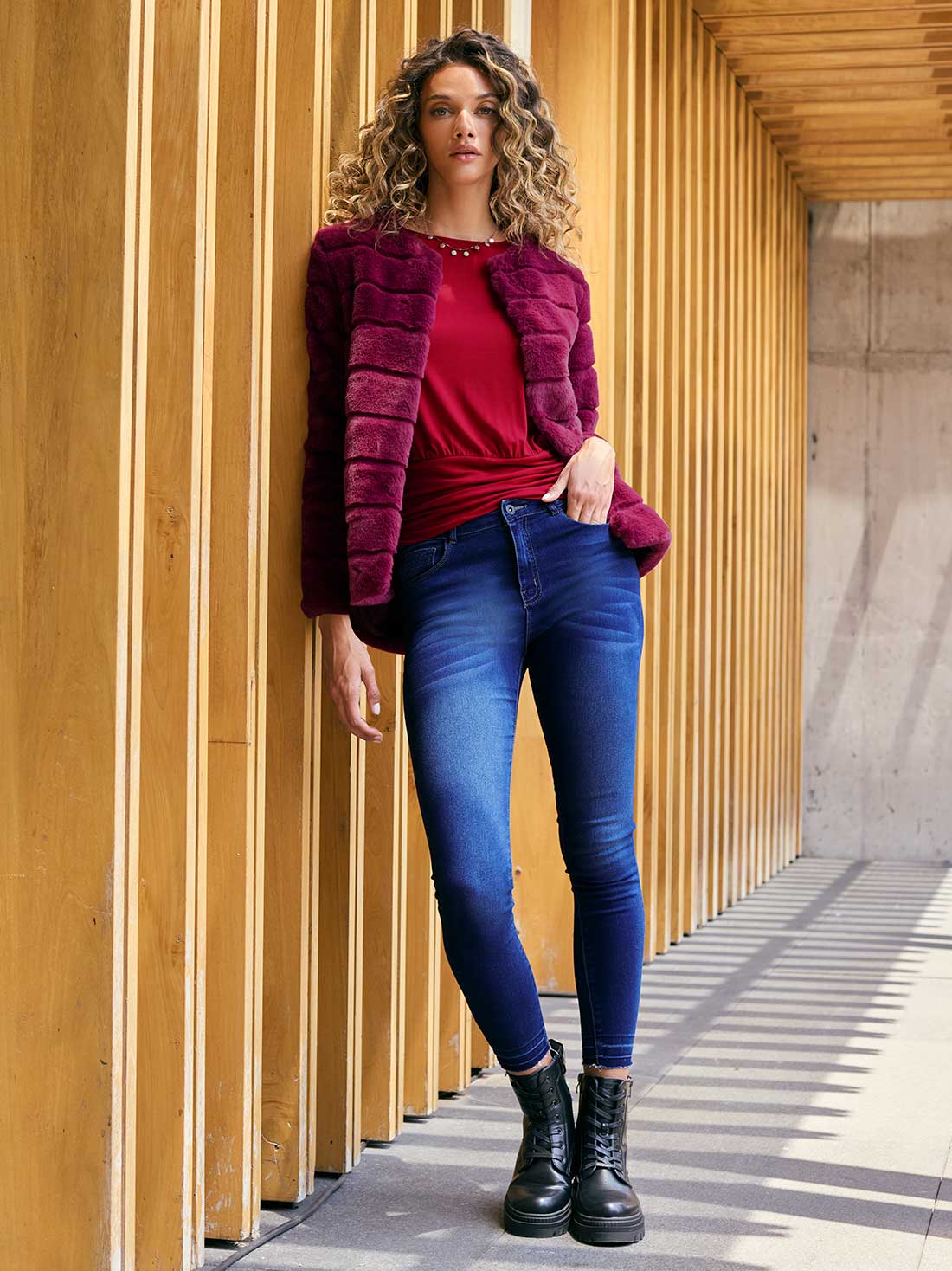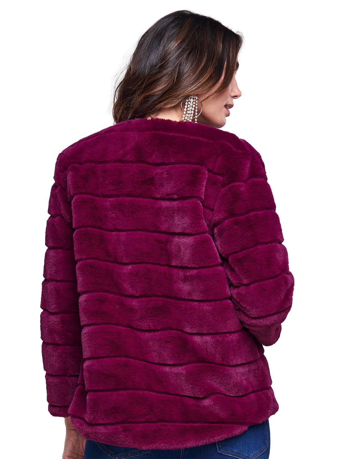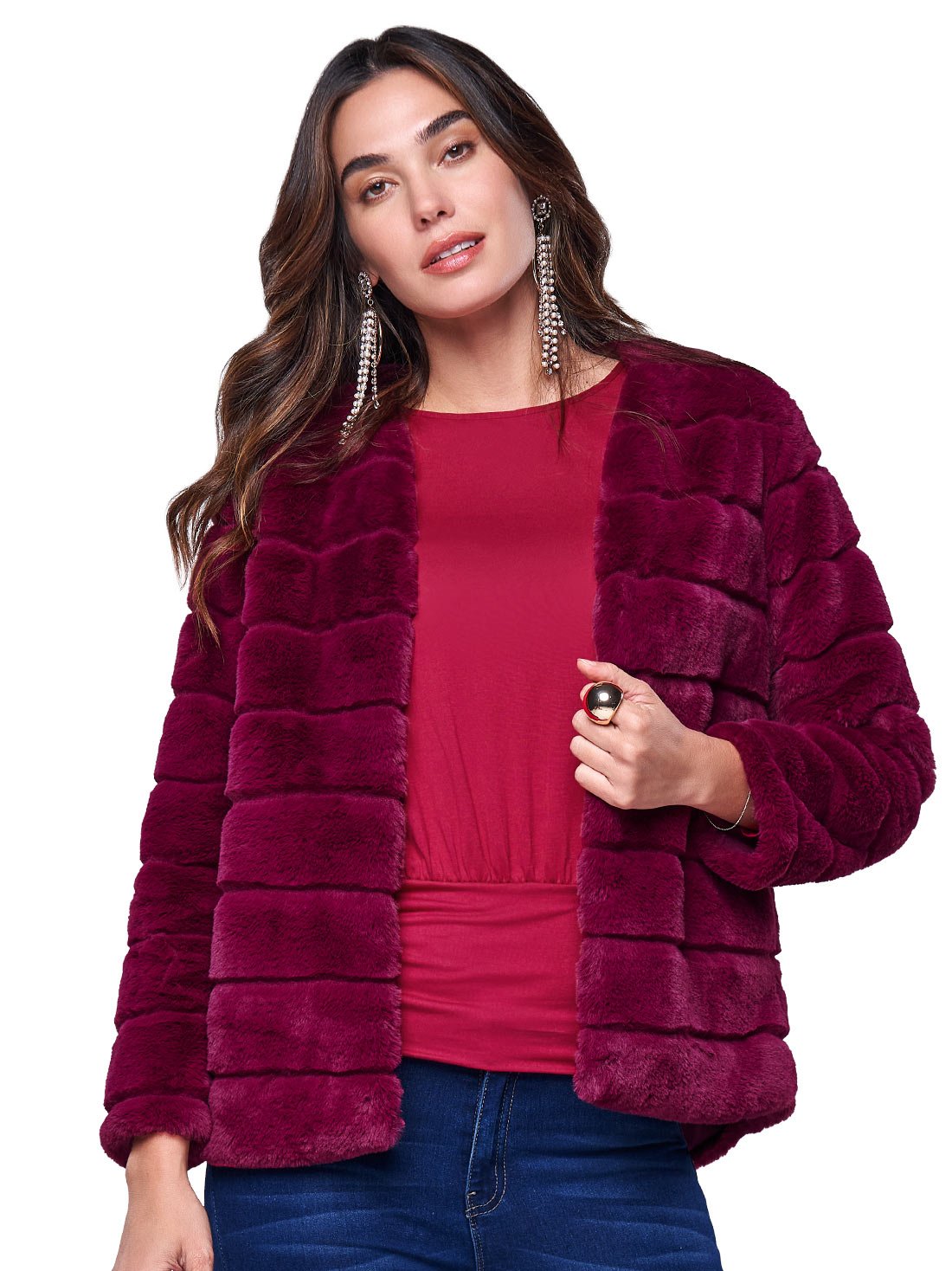 Este abrigo de peluche te da un toque elegante y cálido. Su diseño de franjas y el pelo sintético crean una textura suave y moderna. Los broches al centro y el forro interno lo hacen funcional. ¡Perfecto para destacar en días fríos!