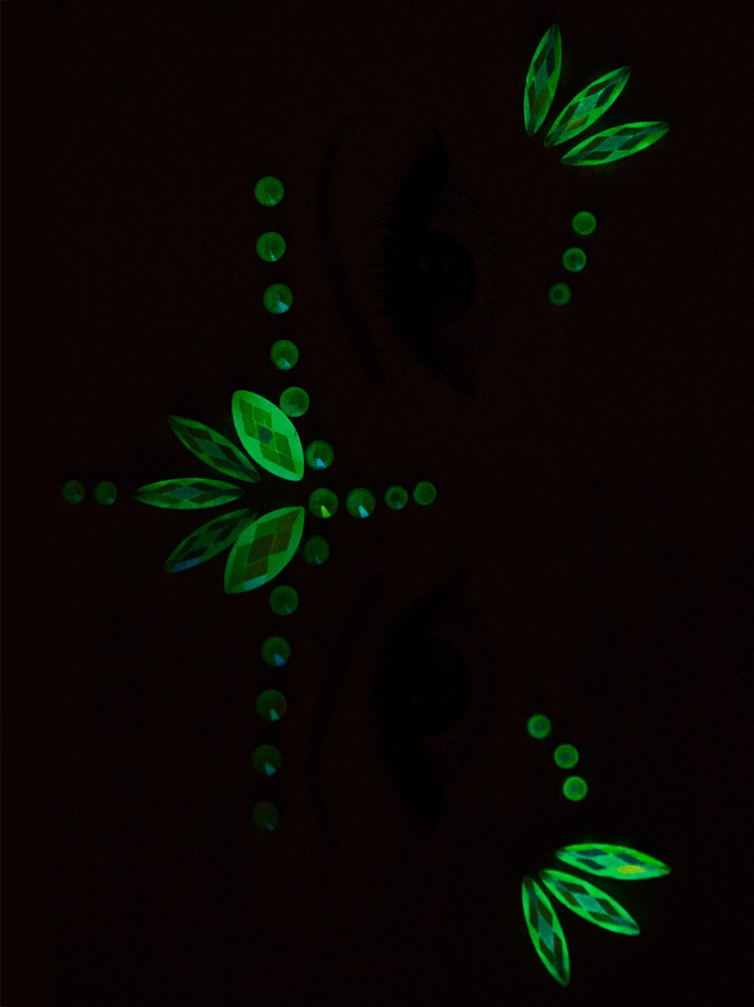 Para elevar tu look agrega las joyas faciales iridiscentes que brillan en la oscuridad, este pack de dos plantillas te permitirán crear combinaciones increíbles en tu maquillaje para diferentes ocasiones.