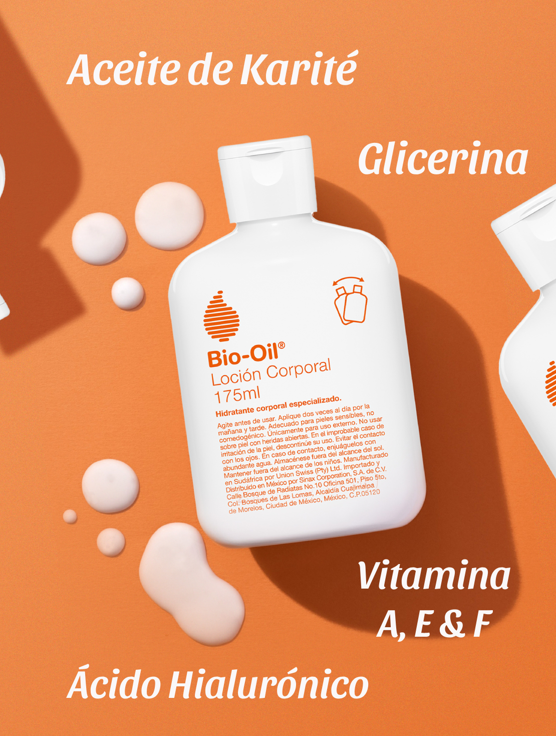 La loción corporal Bio-Oil ha sido formulada para hidratar y reponer la piel suave y seca todos los días, ayudando a mantener el equilibrio de hidratación natural de la piel. Con Bio Oil Body Lotion mantenemos la alta eficacia de nuestros productos y una sensación ultraligera. Agite antes de usar.