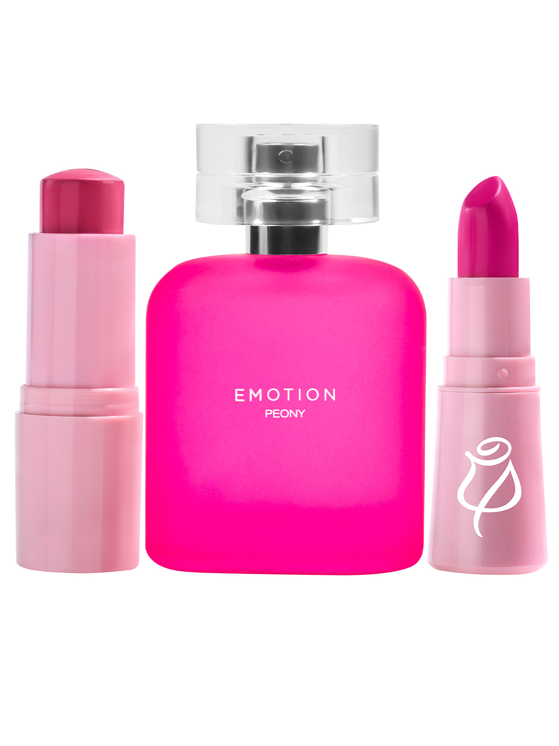 - Incluye blush en barra + lipstick matte + fragancia Peony