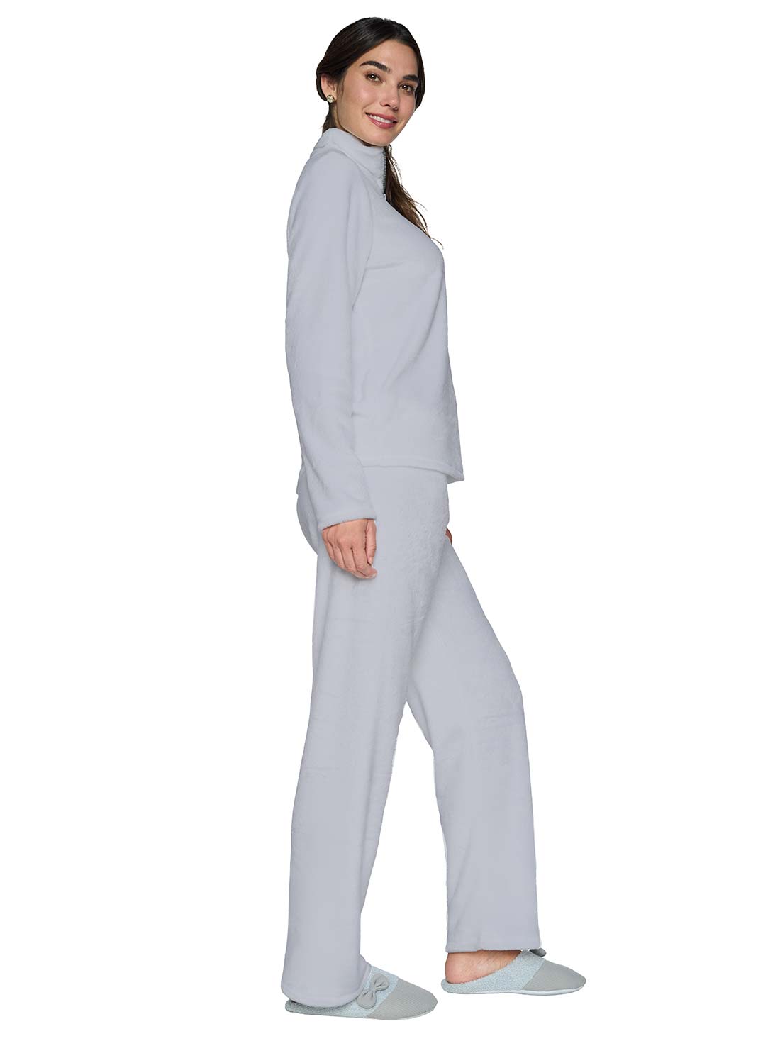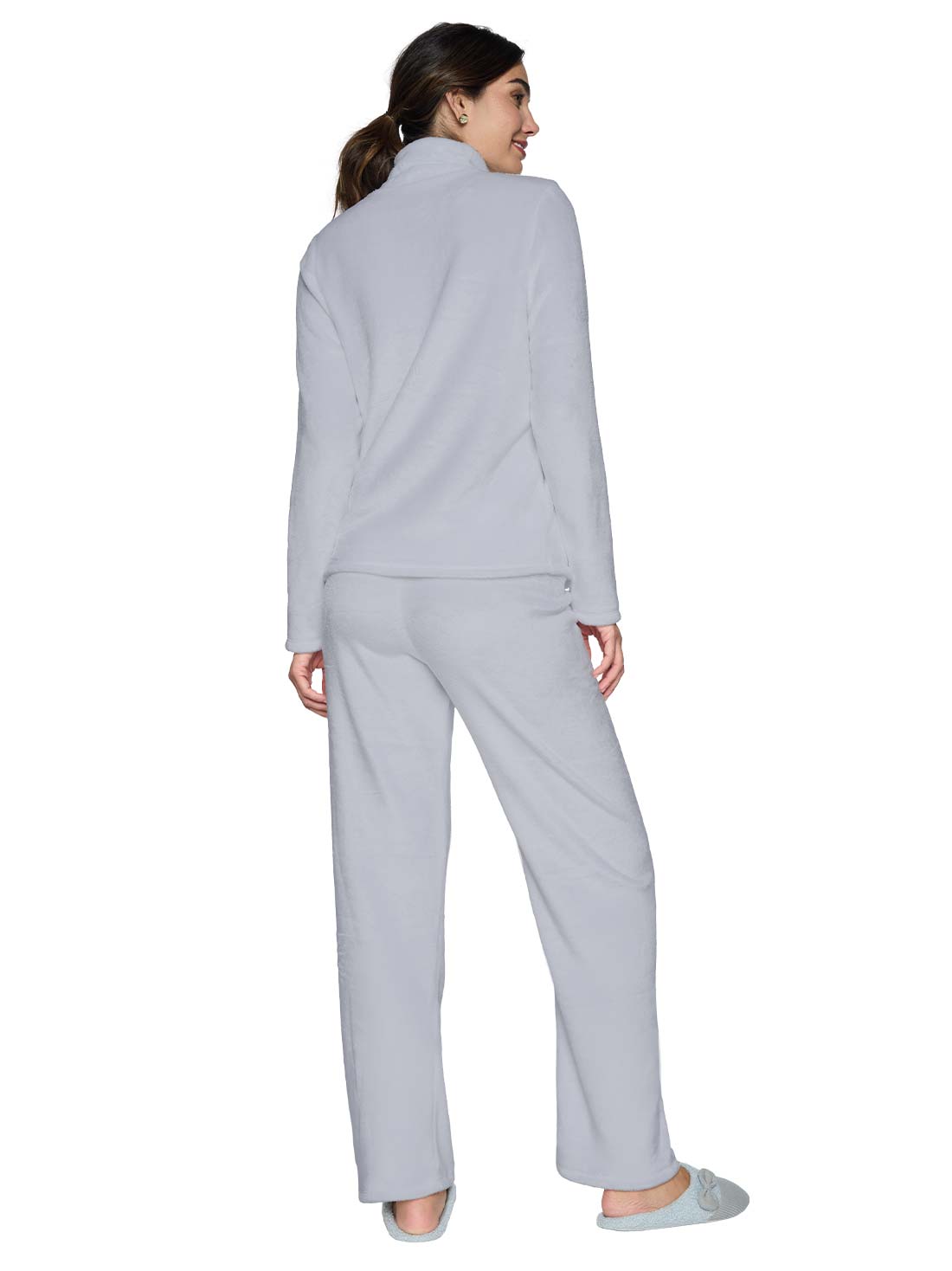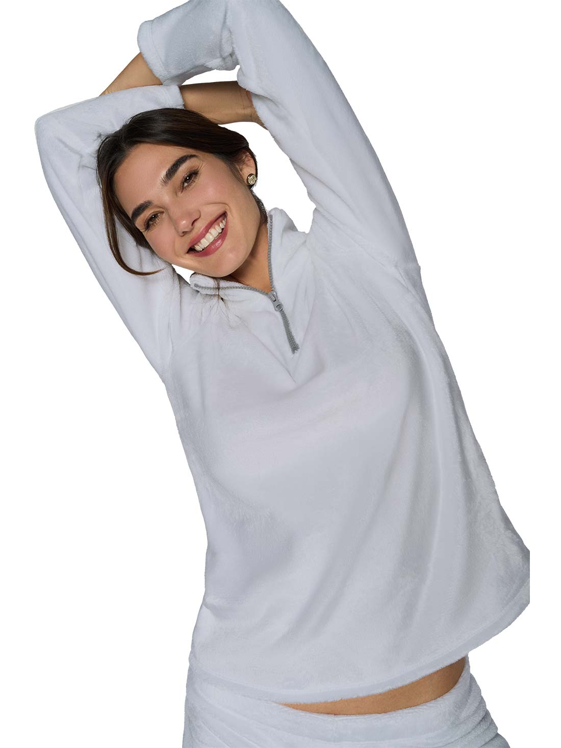 La pijama de peluche mujer con tejido fleece te envuelve en calidez. Su silueta amplia, cuello alto y cierre al frente la hacen funcional y cómoda. ¡Perfecta para noches frías con mucho estilo!