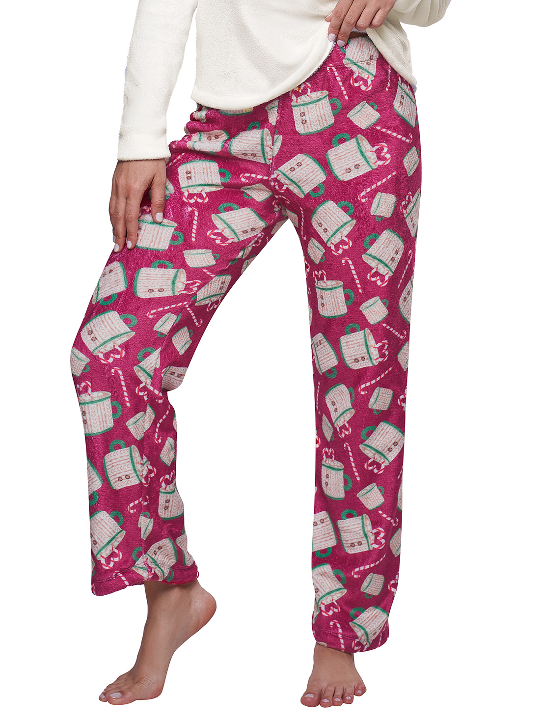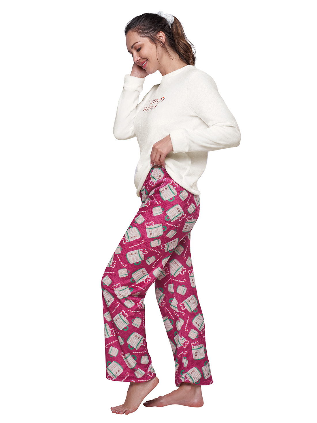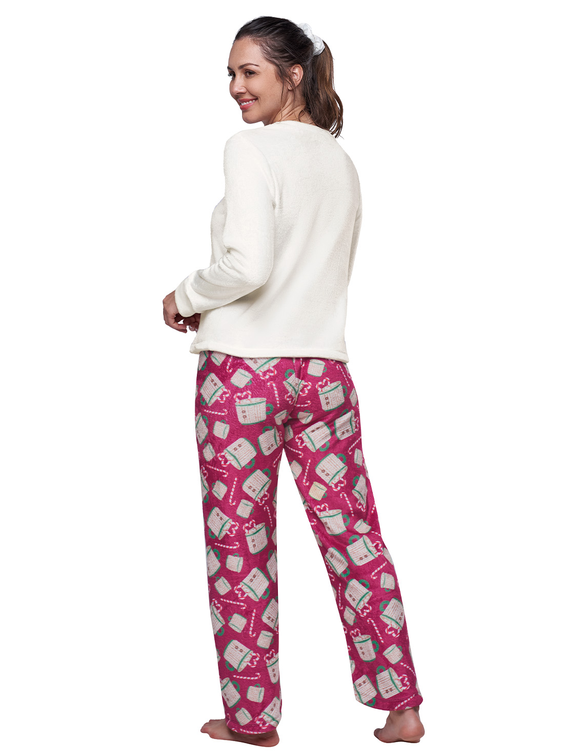 Esta pijama de navidad mujer está hecha en tejido fleece para máxima comodidad. Su silueta amplia y cintura elástica te brindan libertad de movimiento, mientras el bordado 'merry wishes' añade un toque festivo.