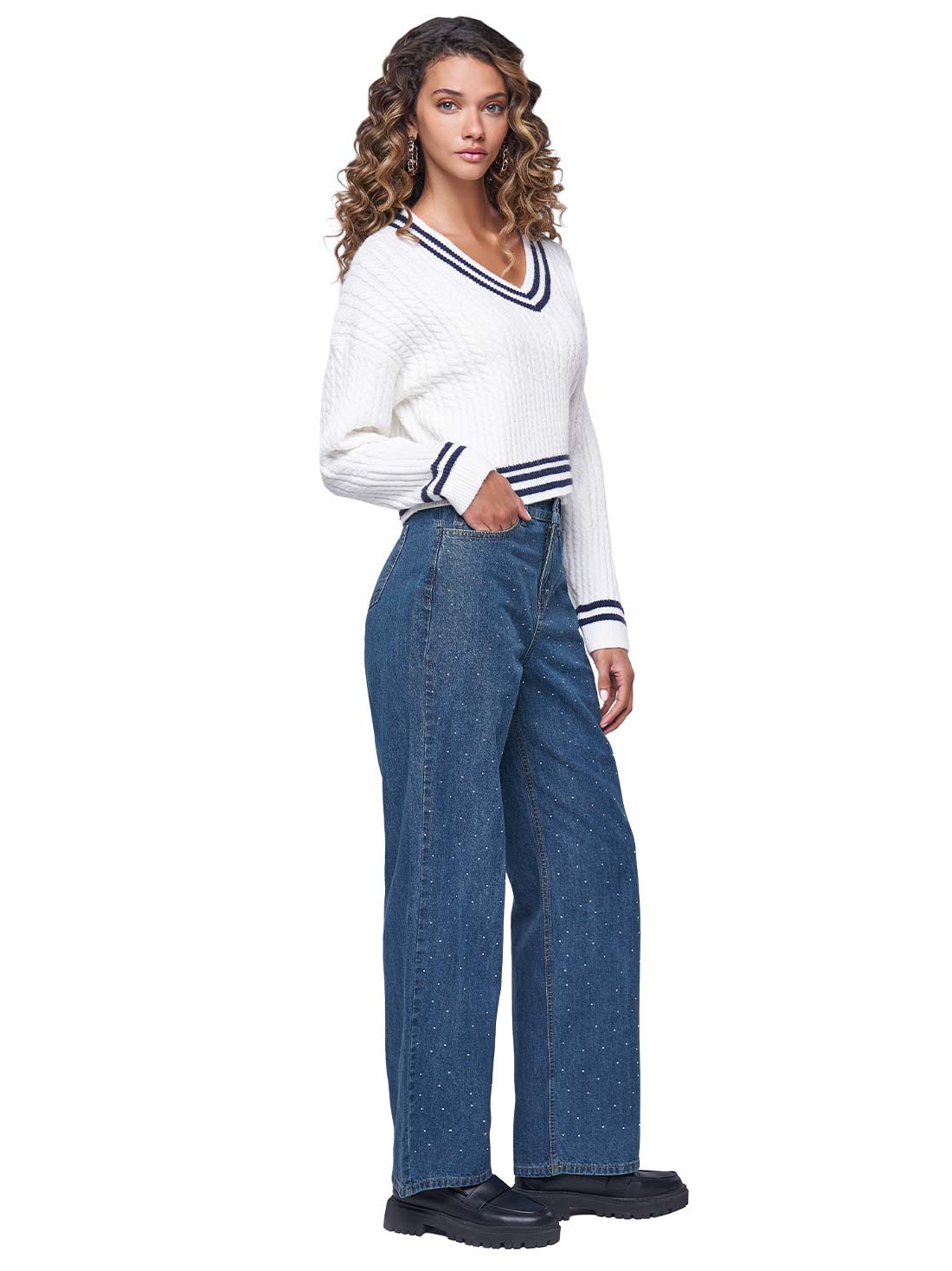 Dale un giro a tu look con estos jeans con brillos. Su corte de pierna amplia y cintura alta estilizan tu figura, mientras los detalles brillantes al frente añaden un toque moderno. La mezclilla sin stretch aporta estructura y comodidad para tu día a día.