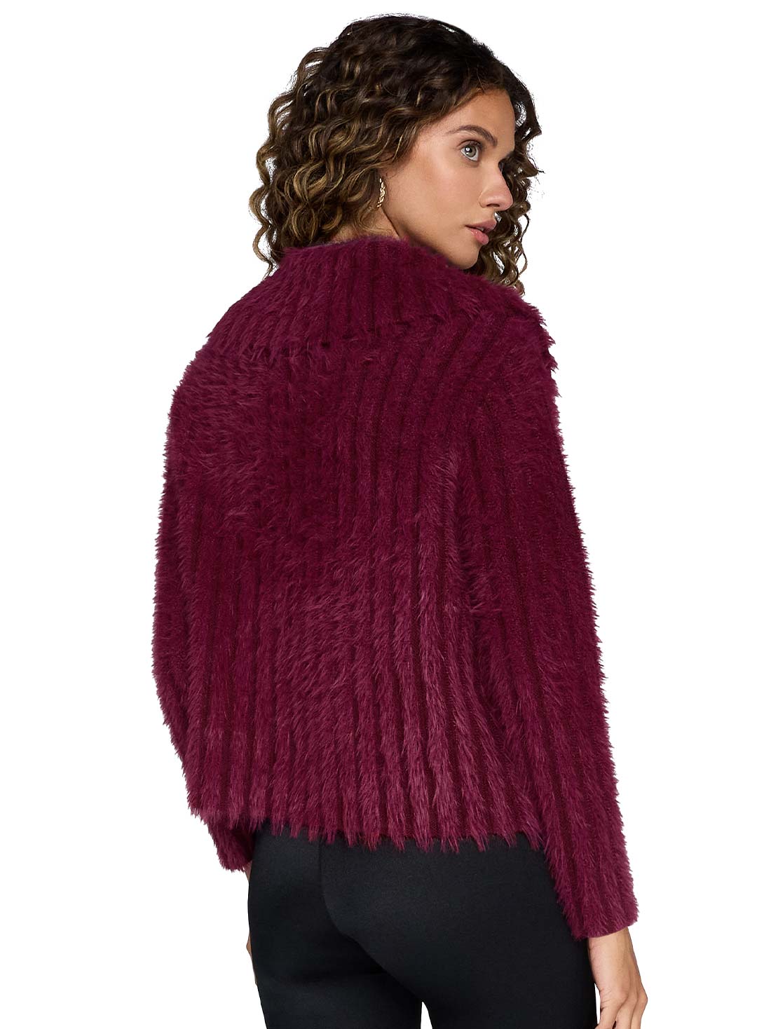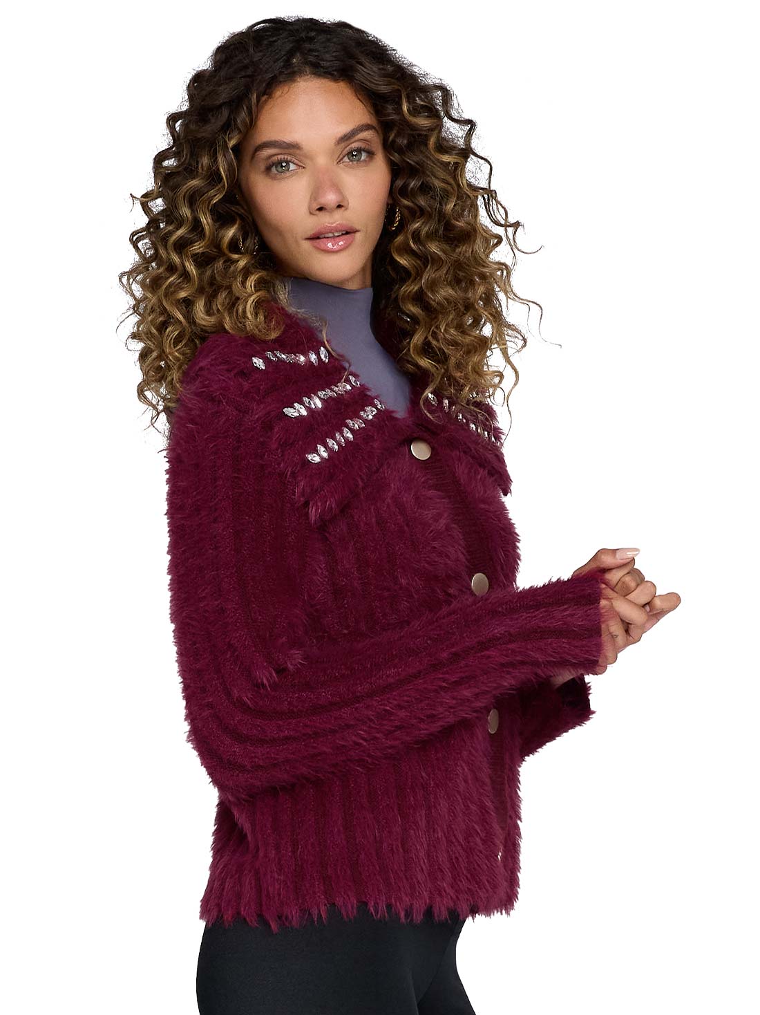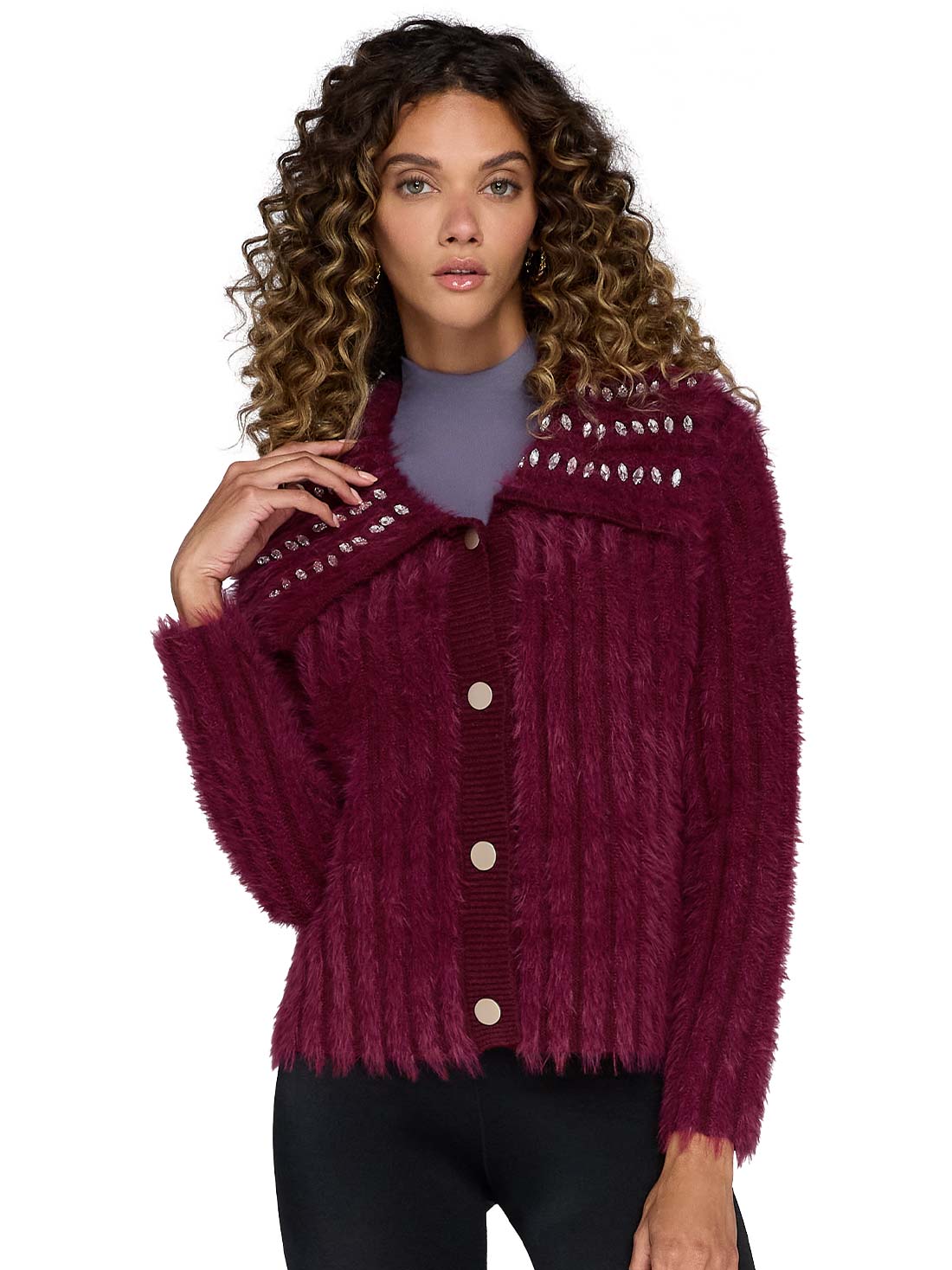 Este sweater tejido tipo angora te envuelve en suavidad. El tejido tipo angora imita el pelo de conejo, brindando calidez y un tacto delicado. Las piedras decorativas en el cuello y los botones funcionales lo hacen especial.