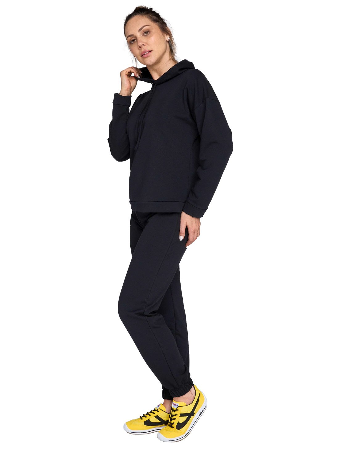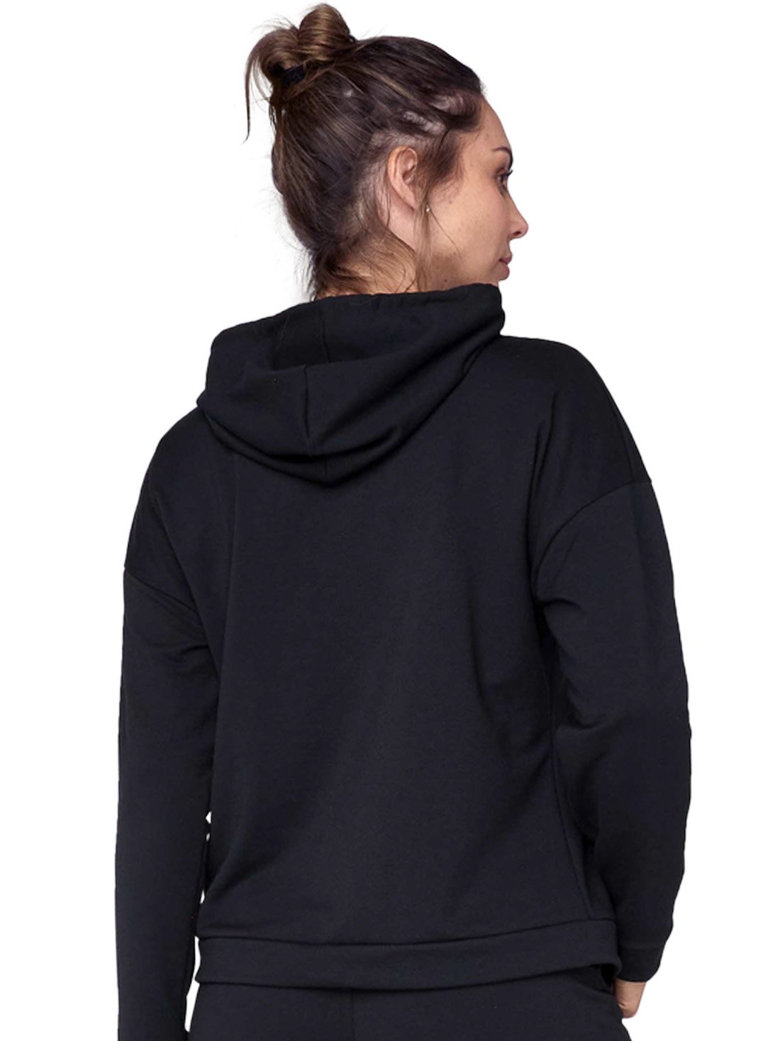 Esta sudadera con capucha es ese abrazo suave que necesitas en días frescos. Su interior afelpado te mantiene calientita, mientras que la silueta holgada y el largo a la cadera te dan libertad para moverte con comodidad.