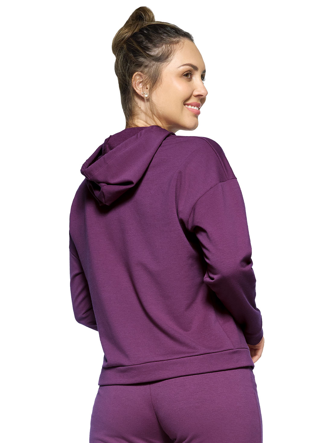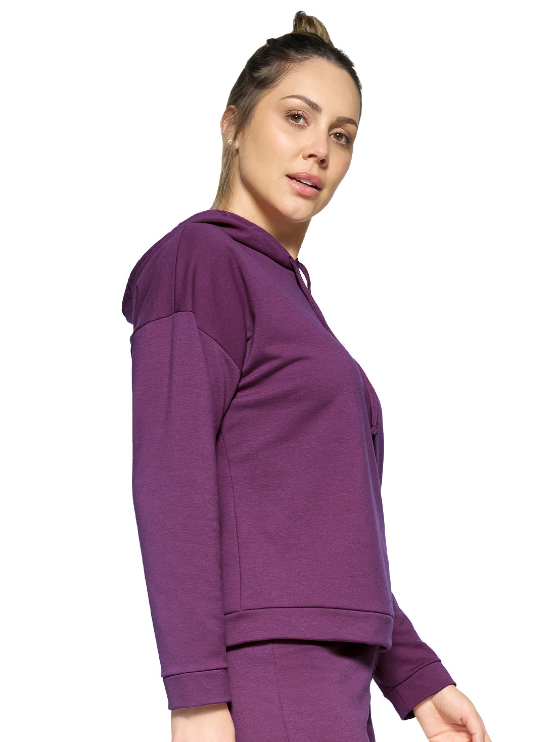 Esta sudadera con capucha es ese abrazo suave que necesitas en días frescos. Su interior afelpado te mantiene calientita, mientras que la silueta holgada y el largo a la cadera te dan libertad para moverte con comodidad.