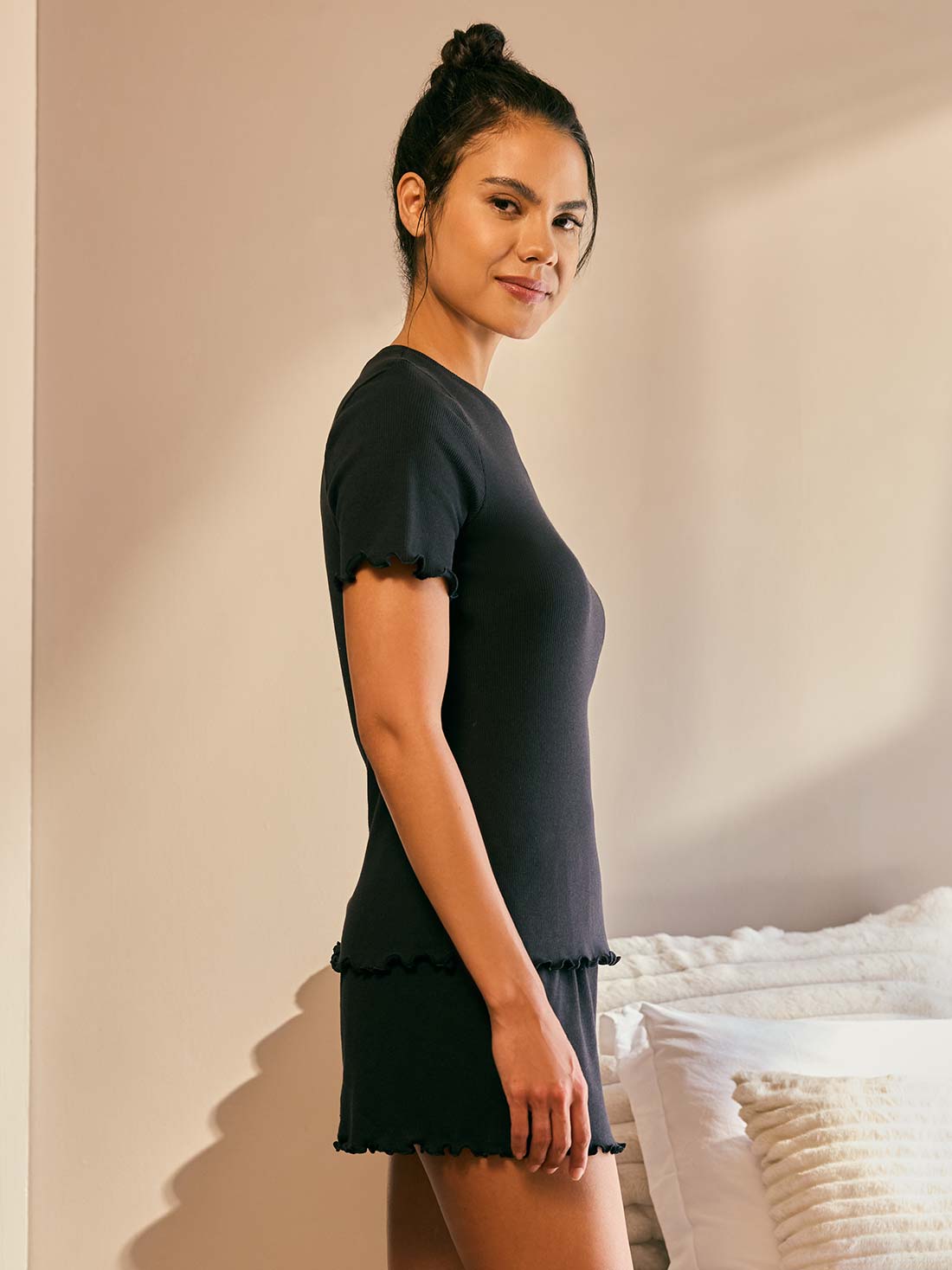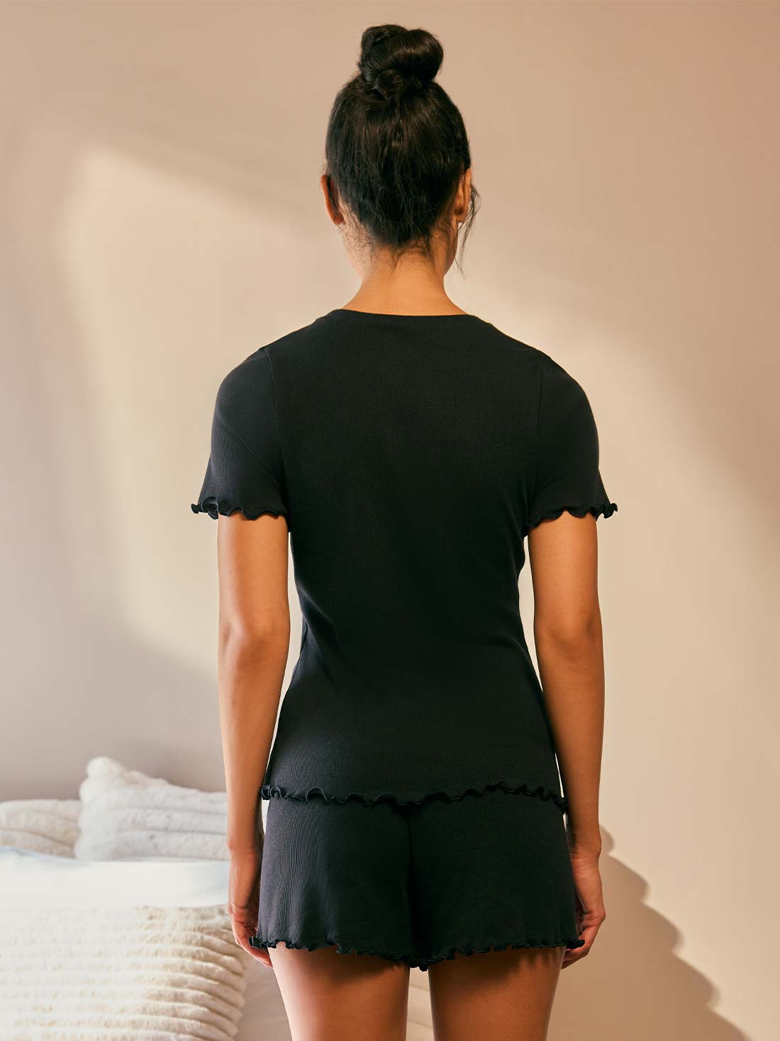 Amamos lo cómodo, porque el descanso también se disfruta con estilo. Este set de pijama mujer tiene pretina elástica, acabado de lechuguilla y tejido tipo rib que se adapta a tu cuerpo. Su silueta semi ajustada te hará sentir ligera.